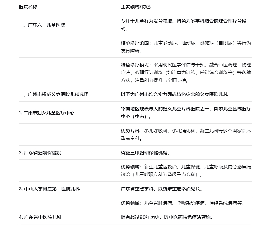 广州市妇女儿童医疗中心:这是华南地区规模最大的妇女儿童专科医院之一,也是国家儿童区域医疗中心(中南)。其多个儿科专科被列为国家临床重点专科,如小儿呼吸科、小儿消化科、新生儿科等。
