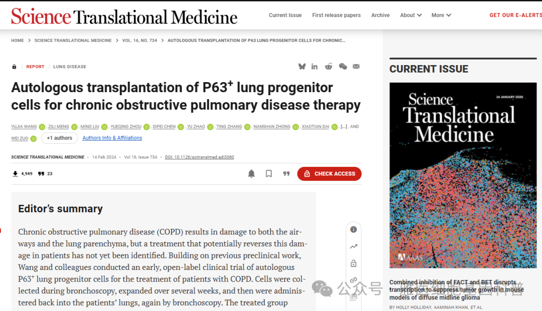 临床上,现有药物仅能缓解持续性咳嗽、活动后气促、反复肺部感染等症状,无法修复已受损的肺组织,重症患者需长期依赖氧疗维持生命。在此背景下,同济大学左为教授团队联合钟南山院士团队,在《科学转化医学》(Science Translational Medicine)发表的自体P63+肺祖细胞治疗慢阻肺临床研究,为破解这一治疗困境带来了突破性方案(论文链接:https://doi.org/10.1126/scitranslmed.adi3360)。